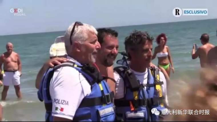 7月30日星期二,意大利副总理兼内政部部长萨尔维尼(Salvini)今日抽空带着他16岁的儿子前往拉文纳省(Ravenna)Milano Marittima海边消暑。当时正在海边巡逻的警察们见到副总理赶忙上前打招呼,并要求合照。“随和”的副总理在和警察们合影后,悄悄的说了几句话。