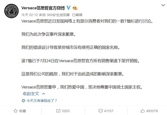 范思哲11日凌晨通过其官方微博称,错误设计导致某些城市没有使用正确的国家名称,该T恤已于7月24日在Versace范思哲官方所有销售渠道下架并销毁。