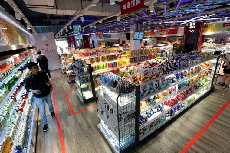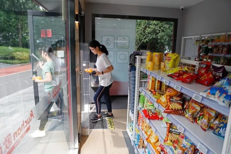 图为无人超市内,顾客买完离开。(图片来源:中新社)