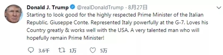 据报道,刚刚参加完在法举行的七国集团峰会的美国总统特朗普27日在其社交网络推特(Twitter)上发文表达了对孔特的支持,称希望他能继续出任意大利总理。特朗普赞其非常有才华,热爱祖国且与美国合作良好。