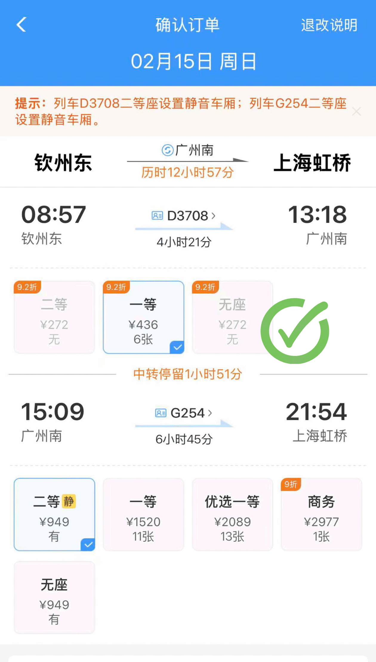 2月20日至21日G4945次南京南至贵阳北二等座打2.7折、全程244元