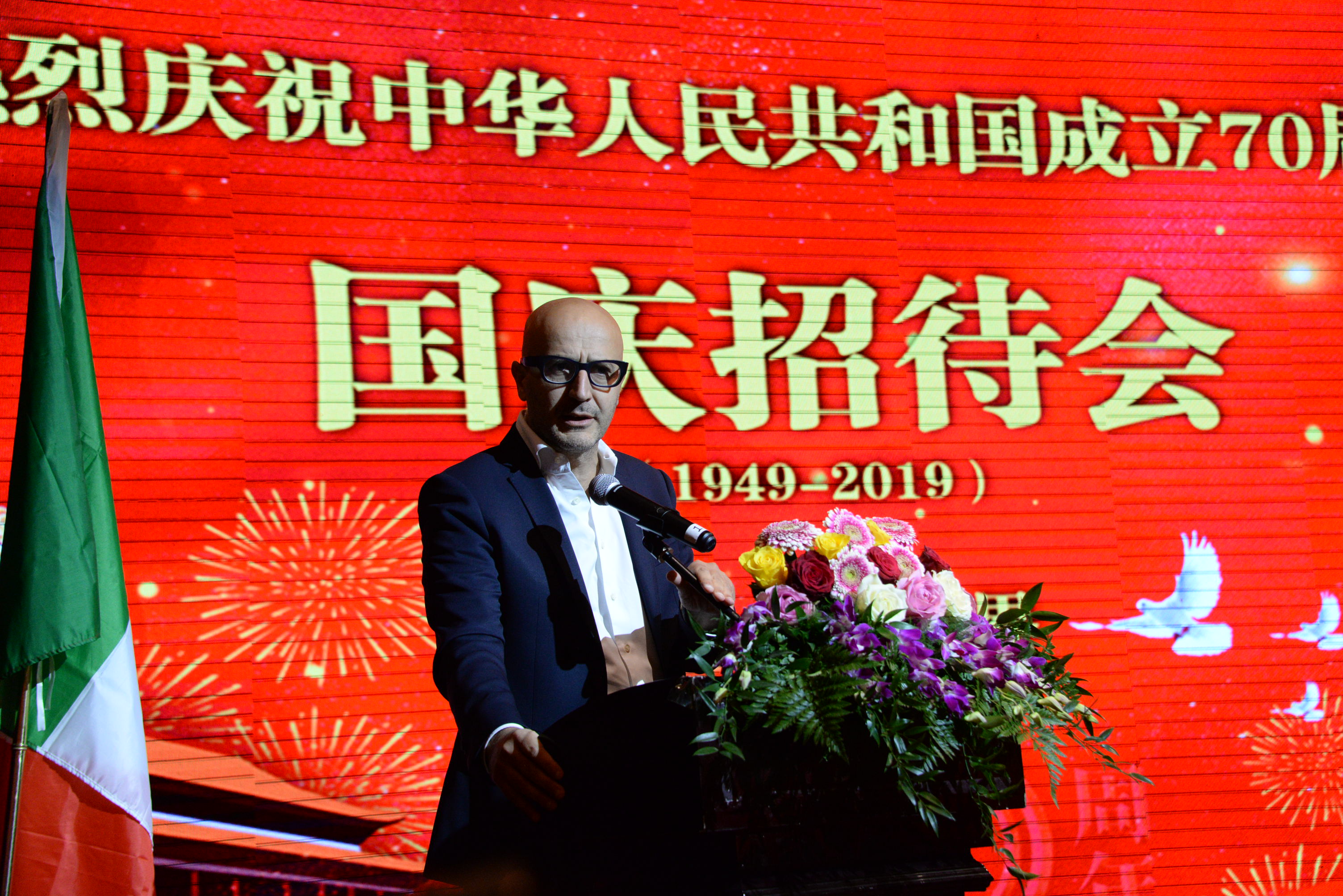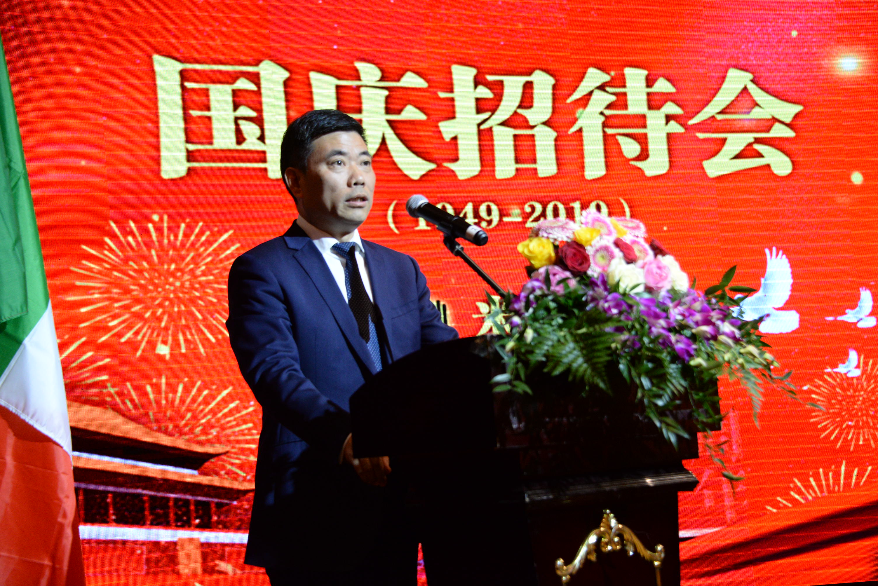 中国驻米兰总领事宋雪峰在致辞中,向出席招待会的嘉宾畅谈中国发展、华侨华人贡献,以及中意友好关系发展的愿景。他首先代表中国驻米兰总领馆向侨胞们致以最诚挚的节日问候,向长期以来支持中国发展,致力中意友好的各界朋友致以最衷心的感谢。新中国70年风雨兼程,在中国共产党领导下,中国发生了翻天覆地的变化,彻底摆脱了贫困。经济总量从300多亿美元增长至13.65万亿美元,增长了450倍。载人航天、人工智能、量子科学等均取得重大成果,5G技术已经开始走近百姓生活。中国的发展也促进了世界的发展,中国对世界经济增长贡献率连续多年保持在30%左右。中国提出的“一带一路”倡议,已成为中国与沿线国家共商、共建、共享的机遇之路和繁荣之路。新中国的辉煌成就来自全国各族人民的共同奋斗,来自海外华侨华人的不懈支持。70年,是新中国从站起来、富起来到强起来的70年,更是新中国创造世界奇迹的70年,现在的中国比历史上任何时候都更接近中华民族伟大复兴的这个目标,也更有能力、更有信心实现中华民族伟大复兴这个目标。