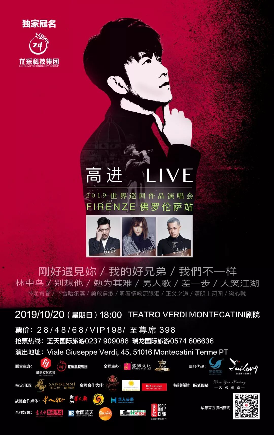 高进“我的好兄弟”作品巡回演唱会陪伴我们走过了中国的一座座城市,接下来海外巡演首站由意大利华意文化传播主办,龙采科技集团独家冠名,罗美雅集团圣贝尼葡萄酒特别支持的演唱会即将于10月20日在意大利佛罗伦萨TEATRO VERDI MONTECATINI 剧院举行。届时高进将携手大壮,孙语赛,田源等嘉宾在意大利佛罗伦萨唱响《我的好兄弟》,《我们不一样》,《刚好遇见你》等众多炙手可热的歌曲,把这一份真挚的兄弟情蔓延至佛罗伦萨这座城市,感染更多的人!