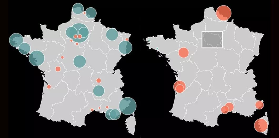(蓝色圆圈代表法国20-30岁男性较多的城市,橙色圆圈则代表女性较多的城市)