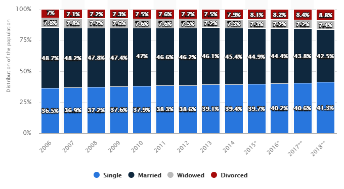 看看这张残酷的感情状态表吧。法国的单身率,真是在逐年攀升。
