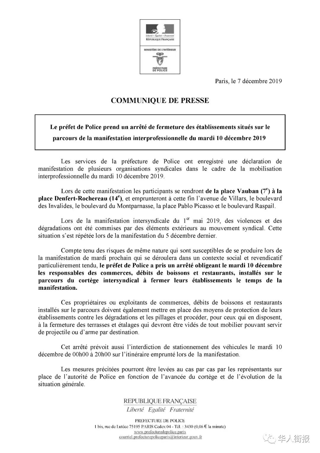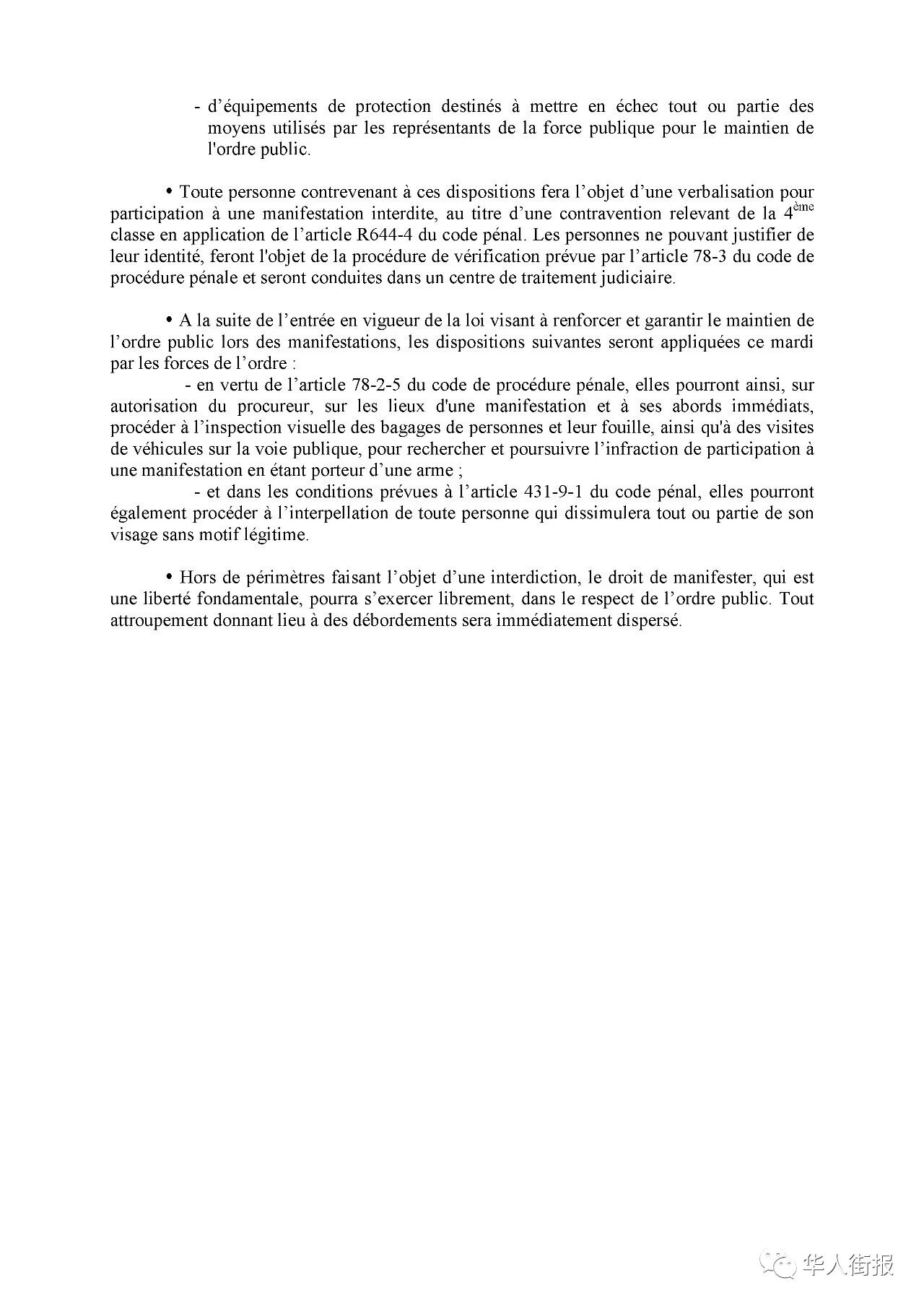 为了防止意外发生,巴黎警察总局发布的通告中,还责令游行路线沿途的所有餐馆酒吧银行超市等,一律关门谢客,而且要清空露天座上的所有桌椅等,以免打砸烧分子用来当做武器。