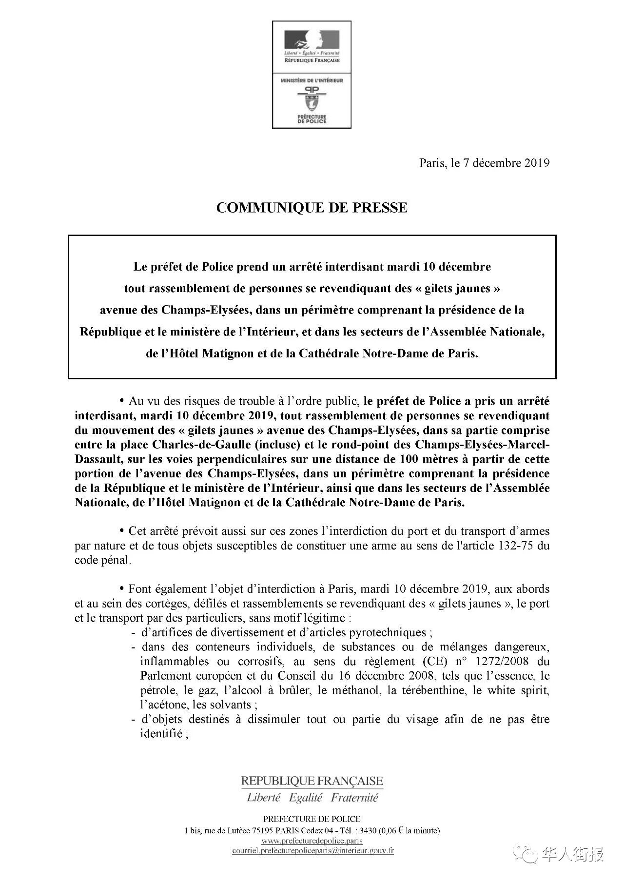 为应对这场规模宏大的全国性大游行,尤其担心出现一年以来黄马甲运动中出现的恶性事件,巴黎警察总局将香榭丽舍大街、总统府、总理府。、国民议会、内政部和巴黎圣母院周边一百米的范围划为禁区,严禁闲杂人等聚集。