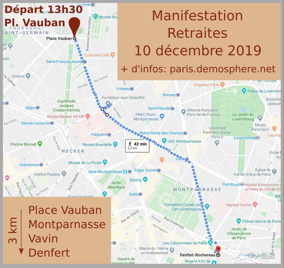 最新一场反对退休养老金制度的全国性大游行即将于下周二(12月10日)到来,巴黎市内的游行线路则如下图所示: