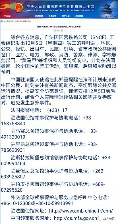 12月5日法国全国性大游行前夕,中国驻法大使馆曾通过其网站,向旅法中国公民和计划来法的中国公民发出警示,要求提高安全防范意识,避免发生意外事件。