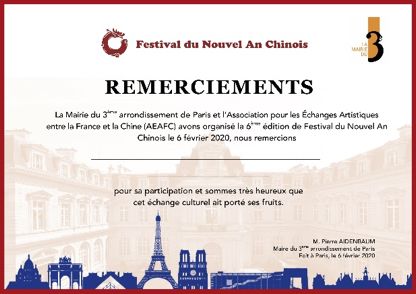 时值中法建交五十六周年之际,中法文化艺术交流协会(AEAFC)联合法国枫丹白露大区阿翁·市政府、巴黎三区政府、大巴黎波比尼公立音乐舞蹈戏剧学院共同举办第六届“巴黎新春艺术节”官方展演及国际展览等系列项目,为2020年巴黎新春时节添加浓墨重彩的一笔。