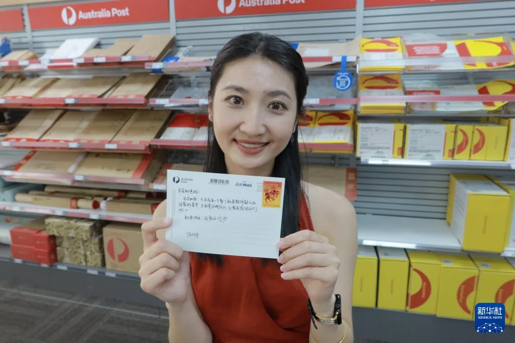 2月4日,在澳大利亚堪培拉,新华社记者王佳琳手举写给远方父母的明信片,上面贴有马年邮票。新华社记者 王佳琳 摄