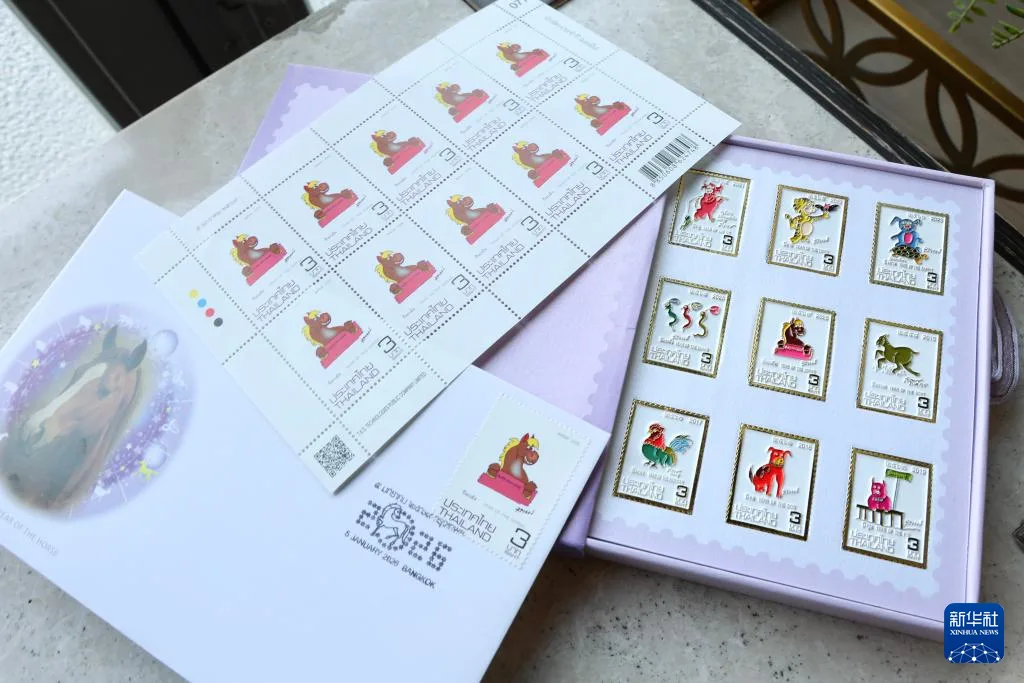 在泰国,马年生肖邮票依旧由诗琳通公主亲自设计。马的形象俏皮可爱,笔触充满童趣。泰国邮政同时推出一套涵盖六个属相的小全张。