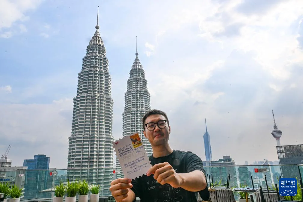 2月5日,在马来西亚吉隆坡,新华社记者王嘉伟手举写给朋友的明信片,上面贴有马年邮票。新华社记者 程一恒 摄