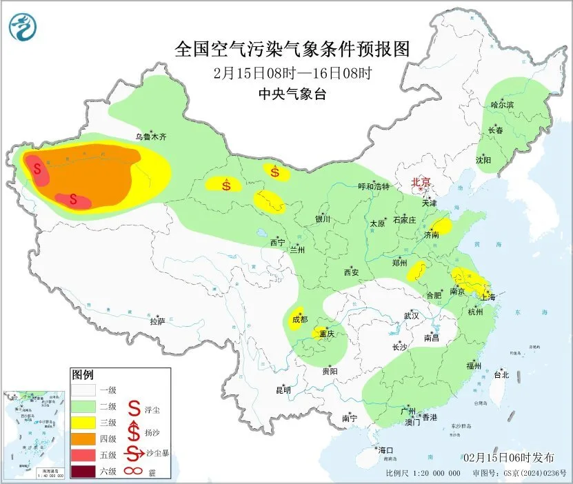 15日,甘肃西部、新疆东部和南部等地有扬沙或浮尘天气。16日至18日,新疆天山北坡等地的大气扩散条件一般,有间歇性轻度霾。