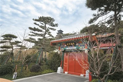 北京园依山而建,园中五棵百年香樟是场地的“原住民”,被完整保留。山径沿树蜿蜒,楼阁隐于林间,主建筑融合了圆明园清晖阁和颐和园澄辉阁古意,红柱飞檐嵌入崖壁。登阁南望,园内美景尽收眼底,远处郭公阁隐约可见。