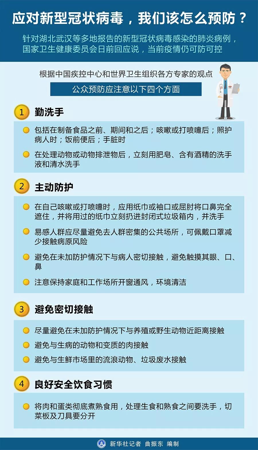 举个最简单的例子:这次的病毒已经证明能够通过眼睛感染人体,所以大家在没有洗手之前,千万不要用手揉自己的眼睛或者嘴巴,以防病毒进入身体。 而大家在使用完口罩后,也千万要记得小心的摘下,切勿揉成一团或触碰到身体其他部位,不然的话病毒粘到手机之类的生活器物上,那戴多少层口罩都没用啦。 下面是小编找到的世界卫生组织(WHO)对预防传染提出的一些建议,希望能够为大家所用: