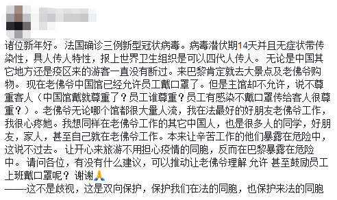 如果你生病到了需要戴口罩的地步的话,你应该做的应该是呆在家里或者医院里,而不是出现在大街上。 所以,绝大多数法国人是根本无法理解不生病却戴着口罩这种行为的。比起歧视,这更像是一种文化冲击。 甚至在一些外国企业当中,是不鼓励员工戴着口罩上班的,这不仅是对周围人的健康负责,更是有可能会损害公司的形象。