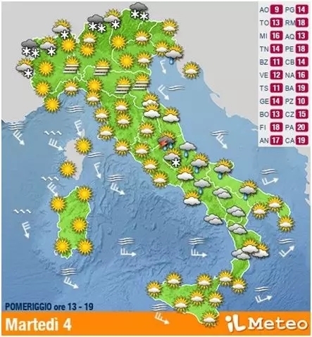据意大利ilmeteo网站报道,受来自阿尔卑斯山的冷空气影响,从今天傍晚开始,意大利东北部地区、亚得里亚海中部和意大利南部地区也将受到影响。