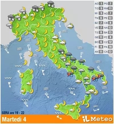今天夜间,来自阿尔卑斯山的冷空气将加强。意大利南部地区天气也逐渐降温,低海拔地区(600至700米以下)将出现降雪。此外,海岸线附近还会出现风暴潮。