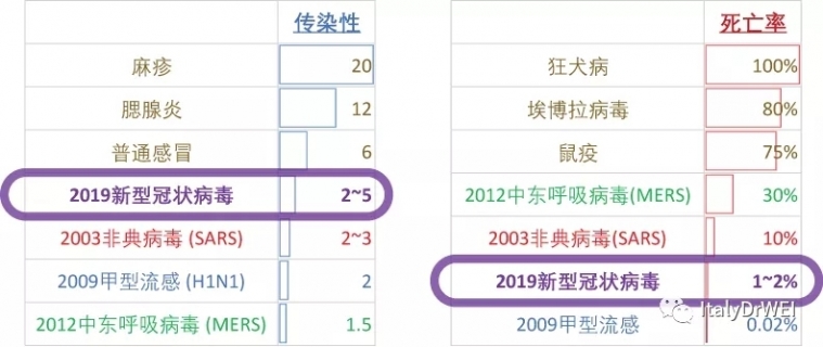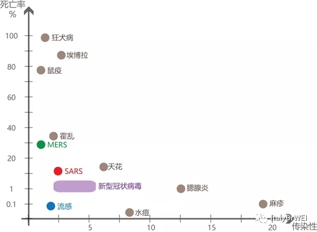 上图中横轴表示传染性,越往右越能感染更多人;纵轴表示死亡率,越向上死亡率越高。幸运的是处于横轴右端和纵轴上端的大多数传染性极强和死亡极高的传染病我们都有了疫苗或者有效的治疗手段。