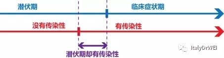 同一个病程可以分为从被病毒侵入到发病(出现症状)的潜伏期和出现症状以后的临床症状期;也可以根据传染性分为非传染期和传染期,传染期病人向外释放有致病浓度的病毒。潜伏期和非传染期并不一定重合,潜伏期越长,这两个时期不重合的部分(紫色)越长,这种病毒越有可能产生潜伏期具有传染性的现象。