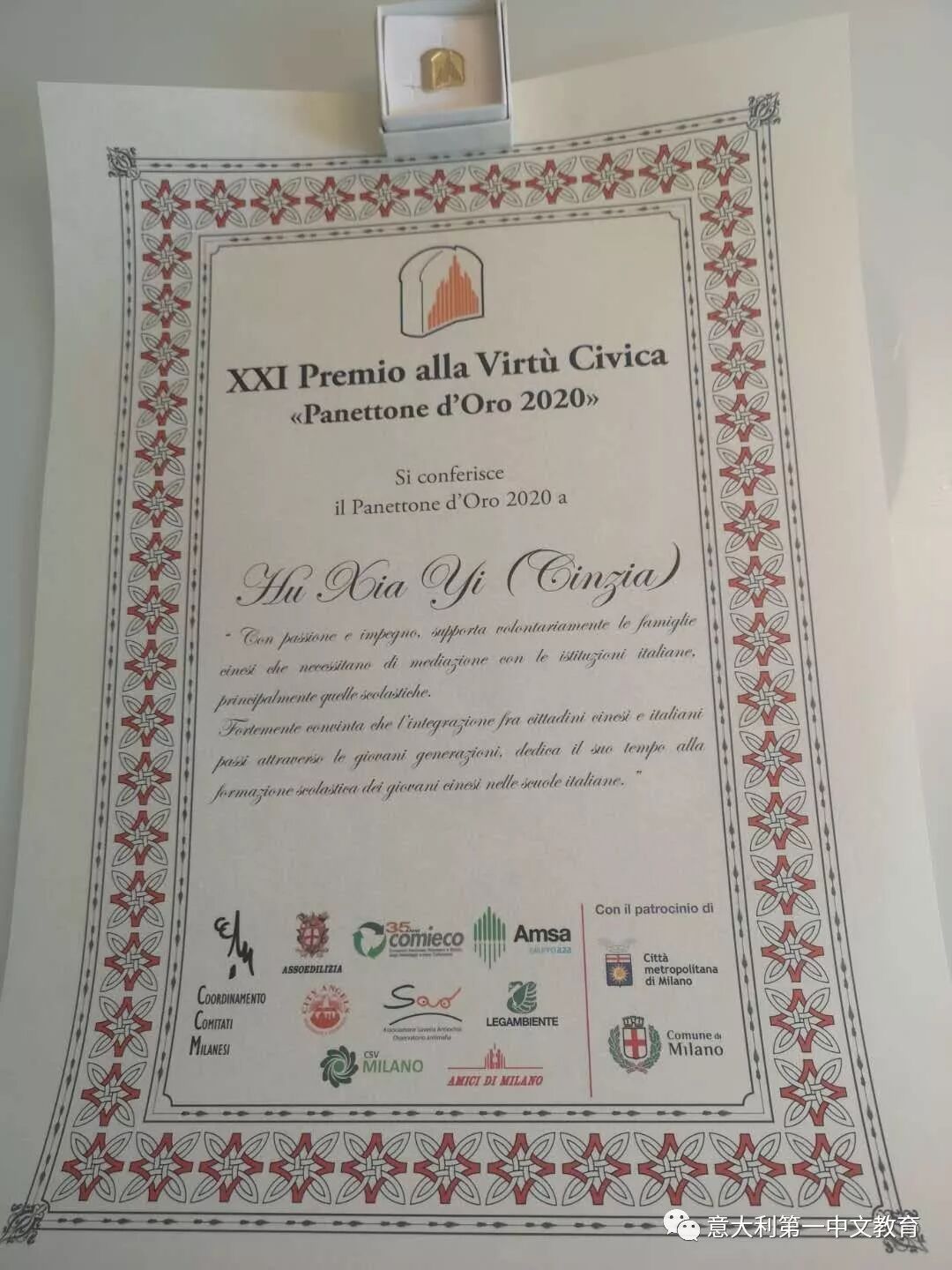 胡夏怡女士代表米兰第一中文学校领取了金面包奖,她本人也跟其他获奖者一样并不想见报,只给我们分享了奖章的照片,在领奖发言中她表示,这不仅仅是米兰第一中文学校的荣耀,更是对无数为传播中华文化而默默奉献的米兰大都市区华文教育者的认可和鼓励。希望大家一如既往,为发展中意文化交流做出应有的贡献。(拓荒供稿)