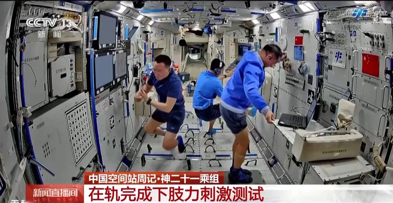 此外,乘组穿着仿生黏附鞋完成下肢力刺激测试,采集数据用于探索肌肉功能保持能力和实现力刺激的运动范式及数据间的关系。