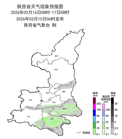 2月16日(除夕):陕北多云,关中、陕南阴天。关中东部局地、秦岭山区、陕南中东部有雨夹雪或小到中雪(0~3毫米)。