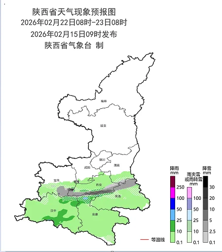 2月22日(初六):全省多云间阴天。关中南部、陕南大部有小到中雨(0~15毫米),秦岭山区有小到中雪(0~5毫米),局地大雪(5~10毫米)(图3)。陕北大部、关中北部、秦岭山区有4级(5.5~7.9米/秒)左右偏北风,阵风6~8级(10.8~20.7米/秒)。日平均气温陕北下降6~8℃,关中、陕南下降4~6℃,其中陕北北部局地下降8~10℃。