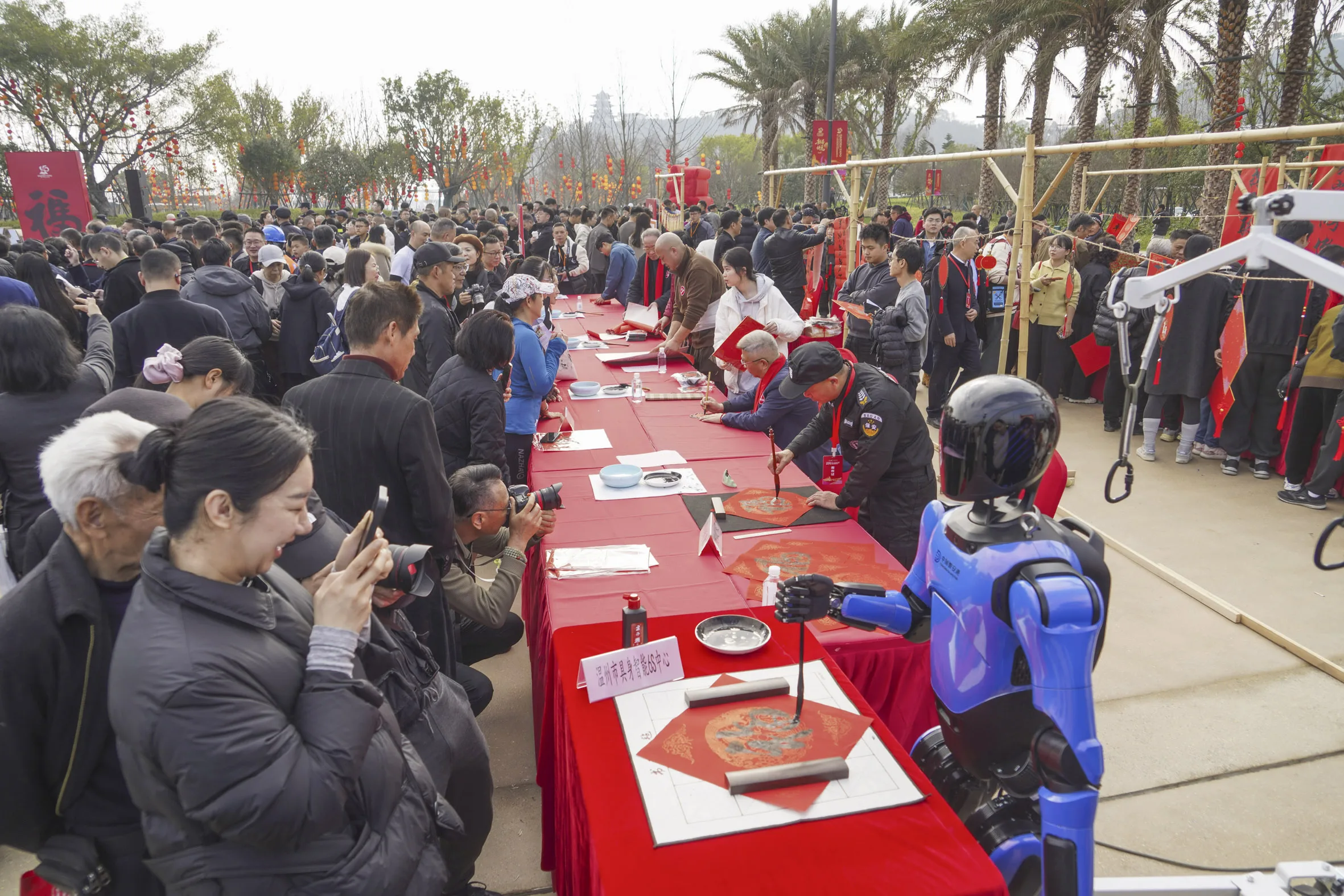 温州网讯 “快看快看,机器人也会写毛笔字!”2月14日上午,温州园博园试运行启幕活动现场人声鼎沸,翰墨飘香。由市文联、温州日报联合开展的“园博墨香 万福迎春”温州书法名家新春送福活动在这里举行,吴聘真、何元龙近20位温州书法名家、保安大叔陶钱荣和书法机器人,共同为市民送上新春祝福。
