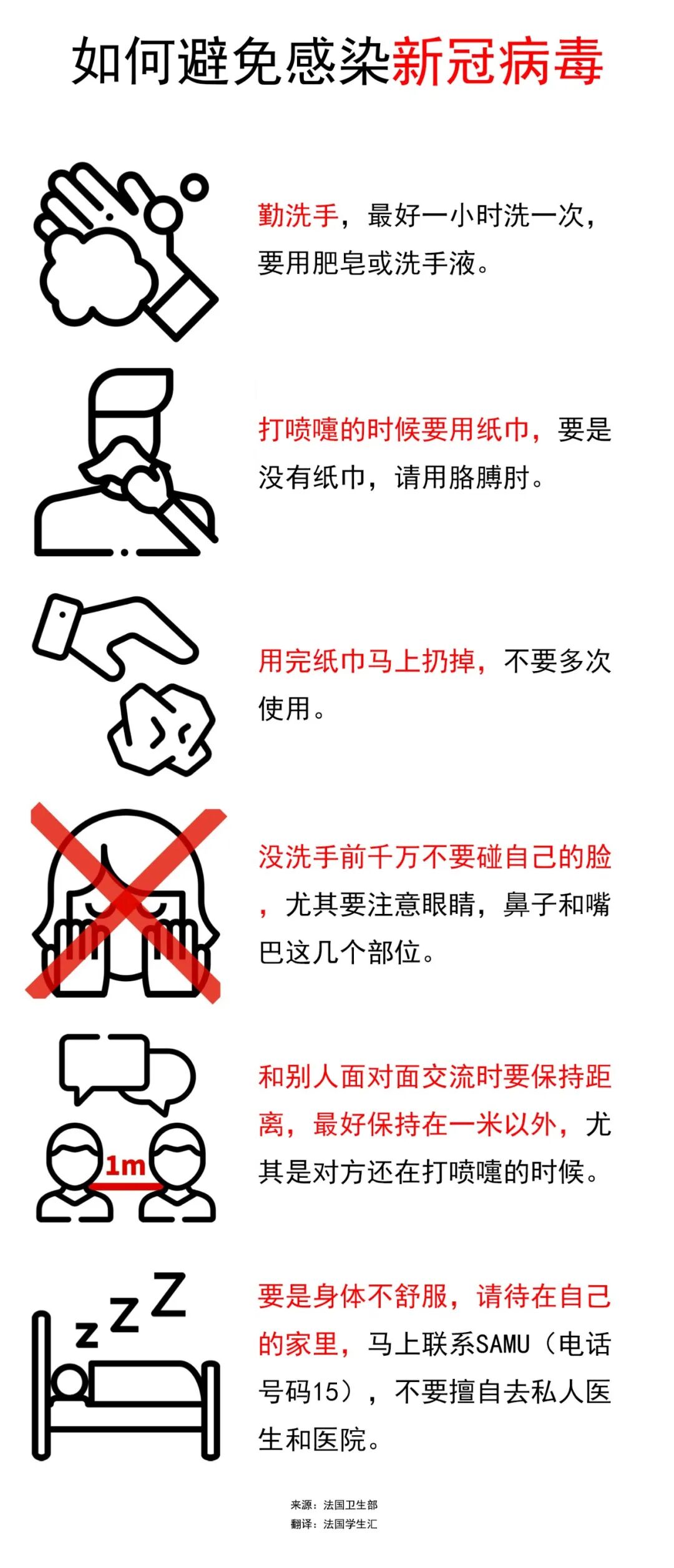 不过,就在今天下午,法国总理Edouard Philippe对目前的防疫工作发表了讲话,再次申明将加强防疫措施,把法国全境内接收治疗新冠肺炎感染者的医院提升到108家,希望法国人民放心。法国卫生部也更新了最新的预防建议,再次强调了洗手的重要性,小编翻译了一下,希望对大家有用啊!