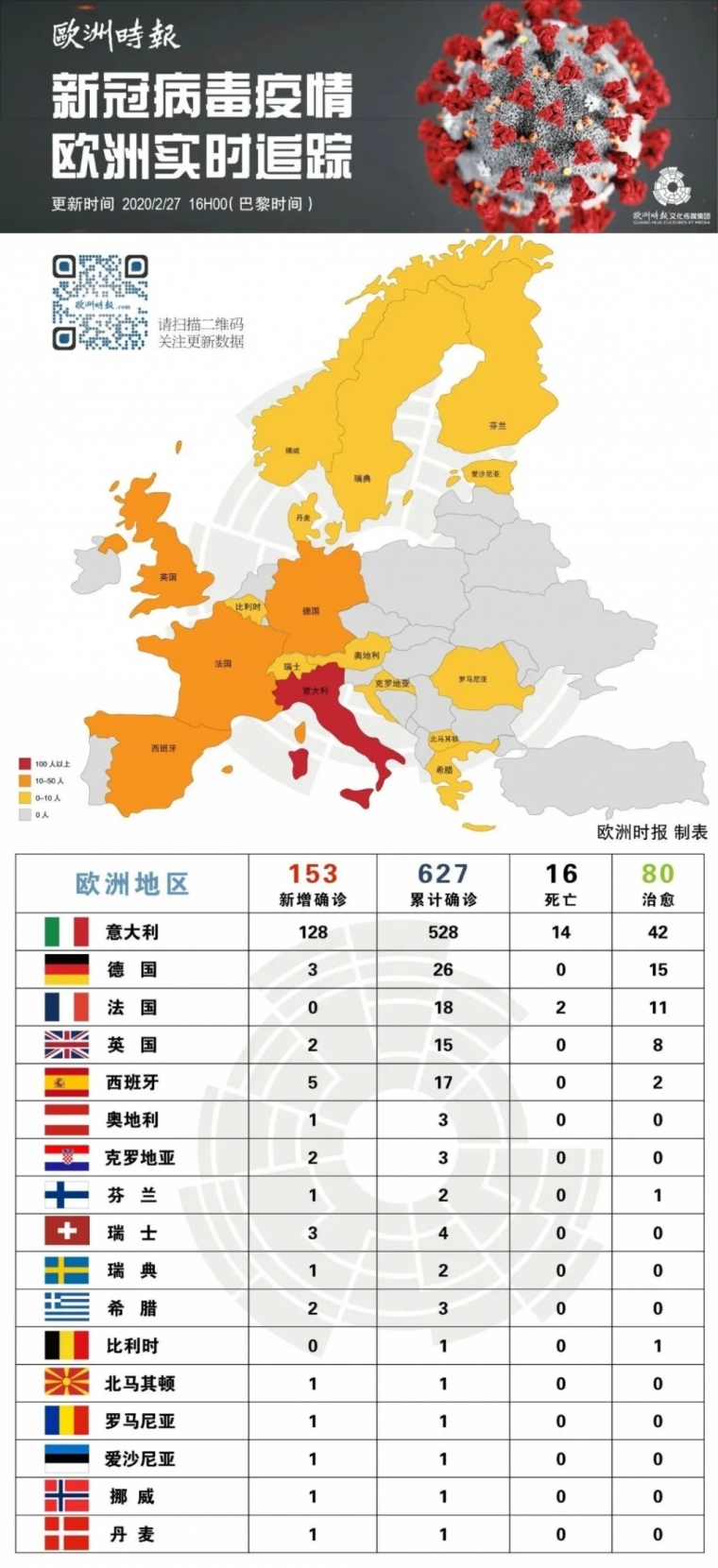 在欧洲其他国家,也都陆续报告了确诊病例,很多病例都与“意大利”有关。