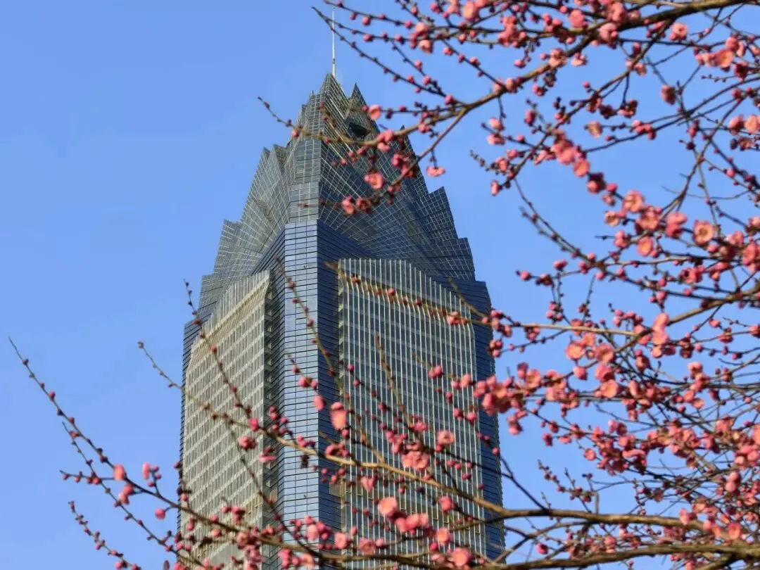 近50株红梅、宫粉梅、绿萼梅错落分布,尤以石拱桥畔最为动人。一树树绯云轻霞倚桥而生,或与石亭飞檐、园外世贸大厦相望,风景园林的诗意精巧和现代建筑相互映衬,是拍摄摄影小品的绝佳取景地。