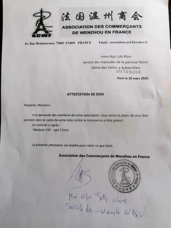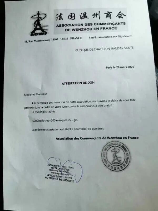 中法服装实业商会在会长陈时成的带领组织下加入“万众一心,共同战'疫'”行动,并于3月27日驰援巴黎第十区政府,向慈善组织Centre d’action sociale de la Ville de Paris捐赠1万个医用口罩。