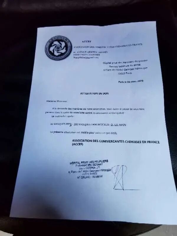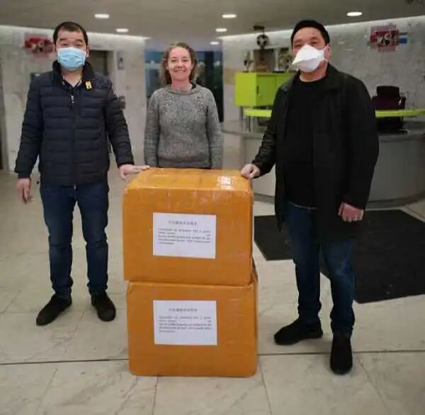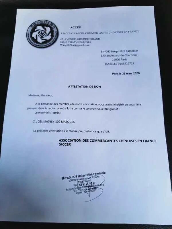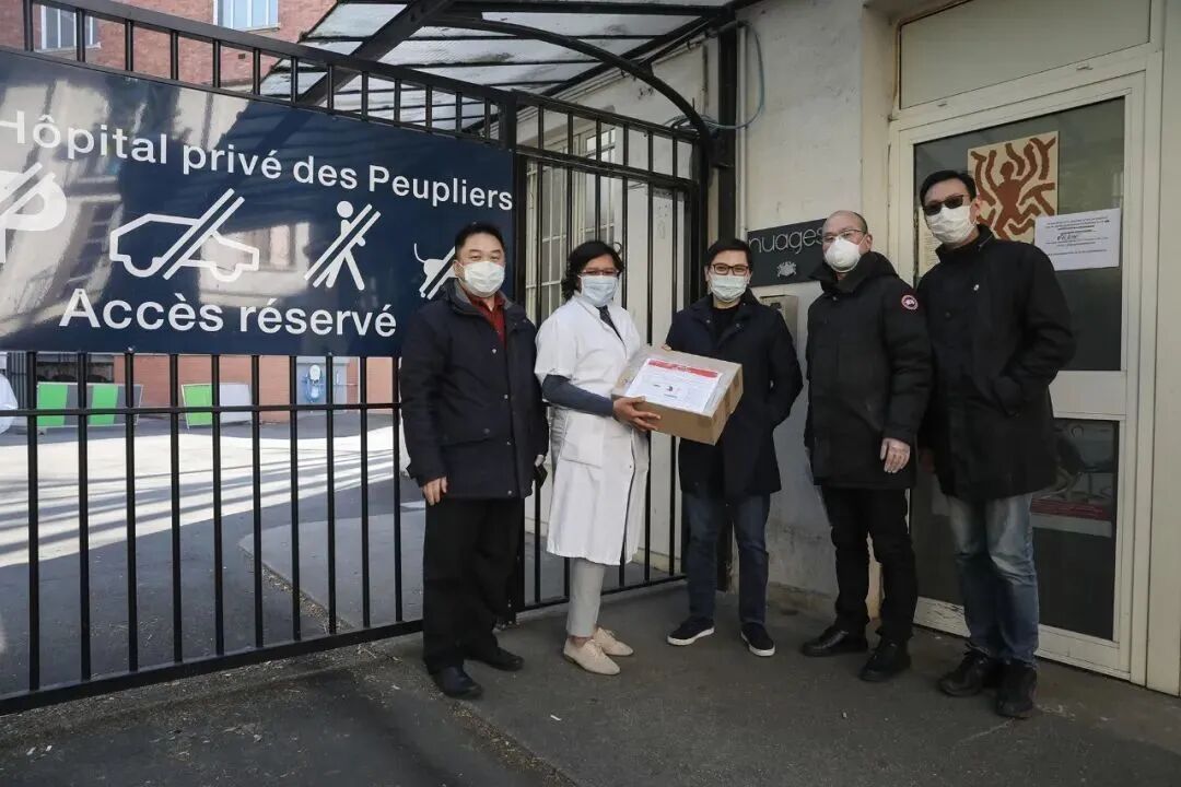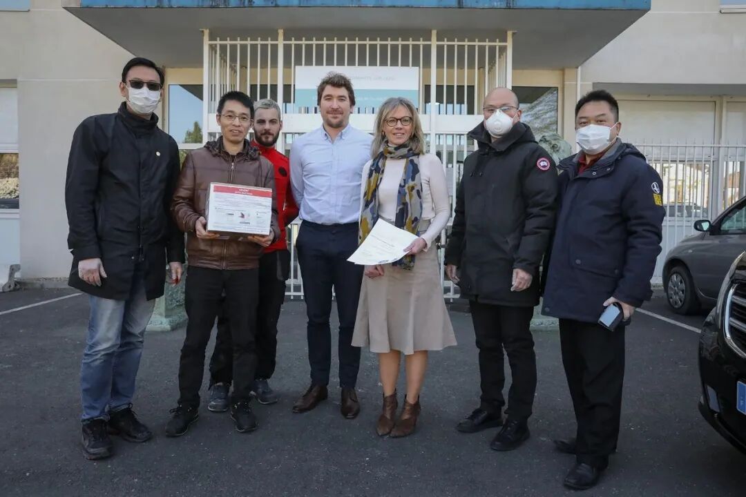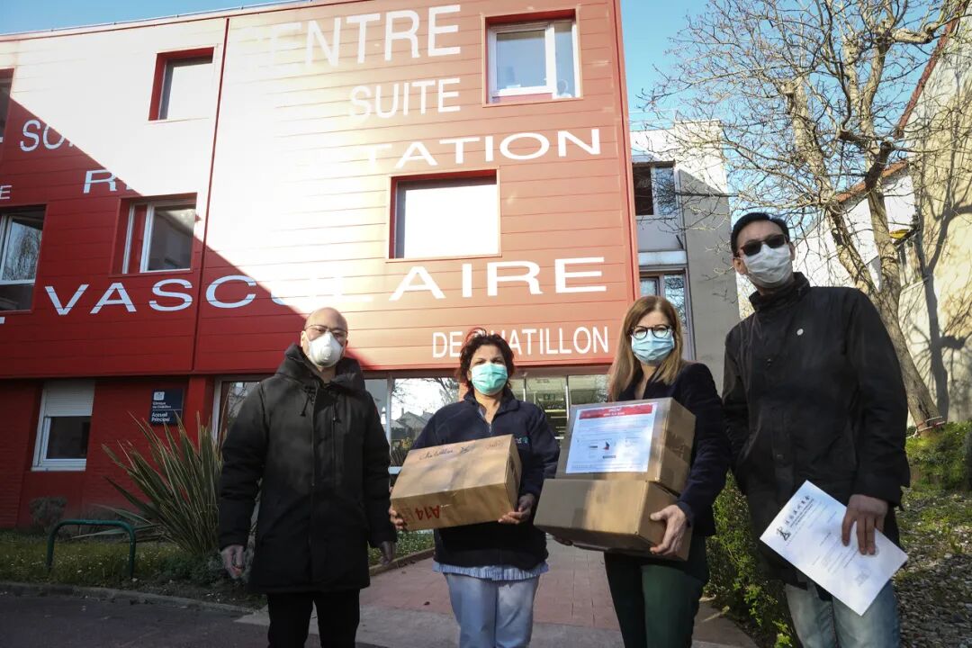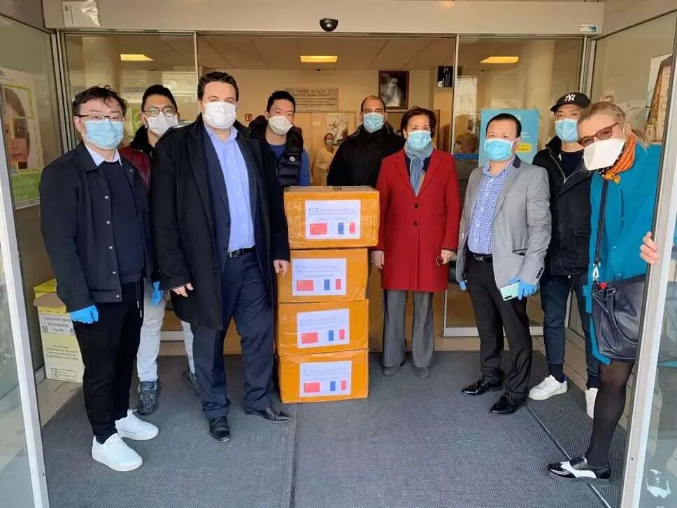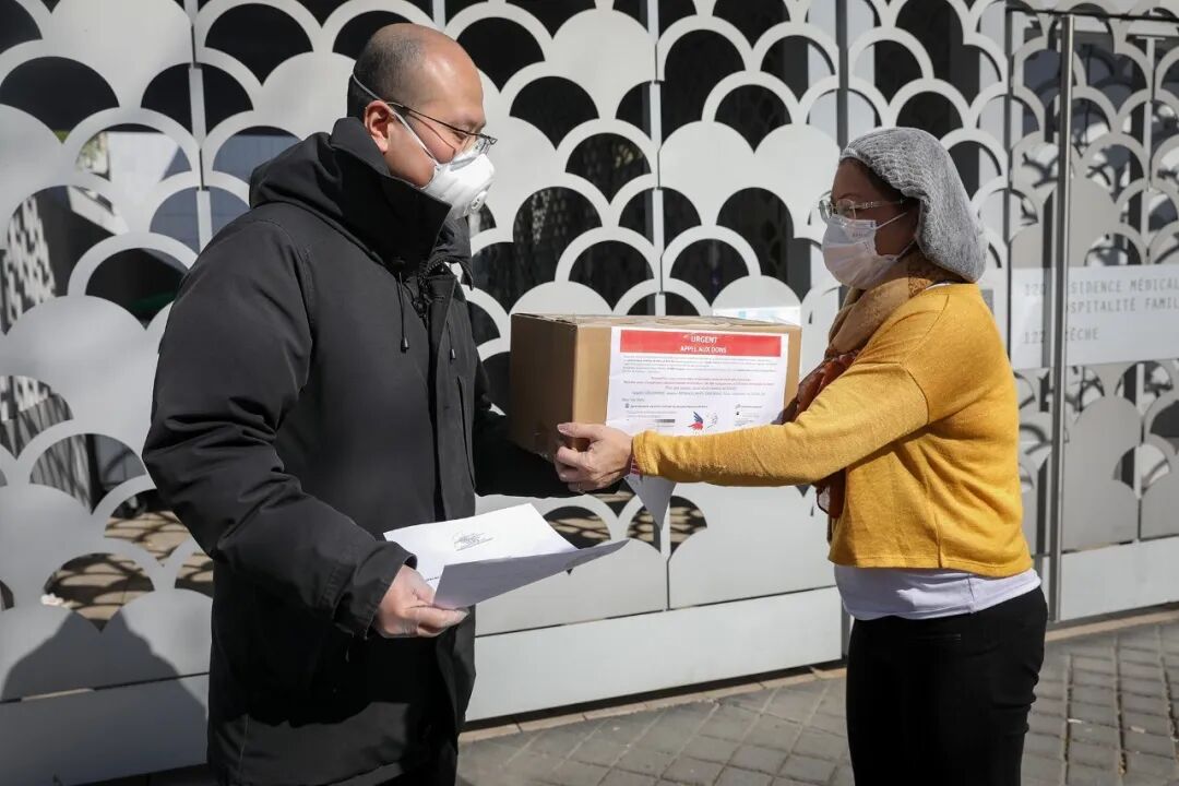 法国中法友谊互助协会向巴黎欧拜赫维利耶市政府、医院、警察局和消防队捐赠一万个医用口罩,受到市长等政府官员的亲自迎接和感谢。
