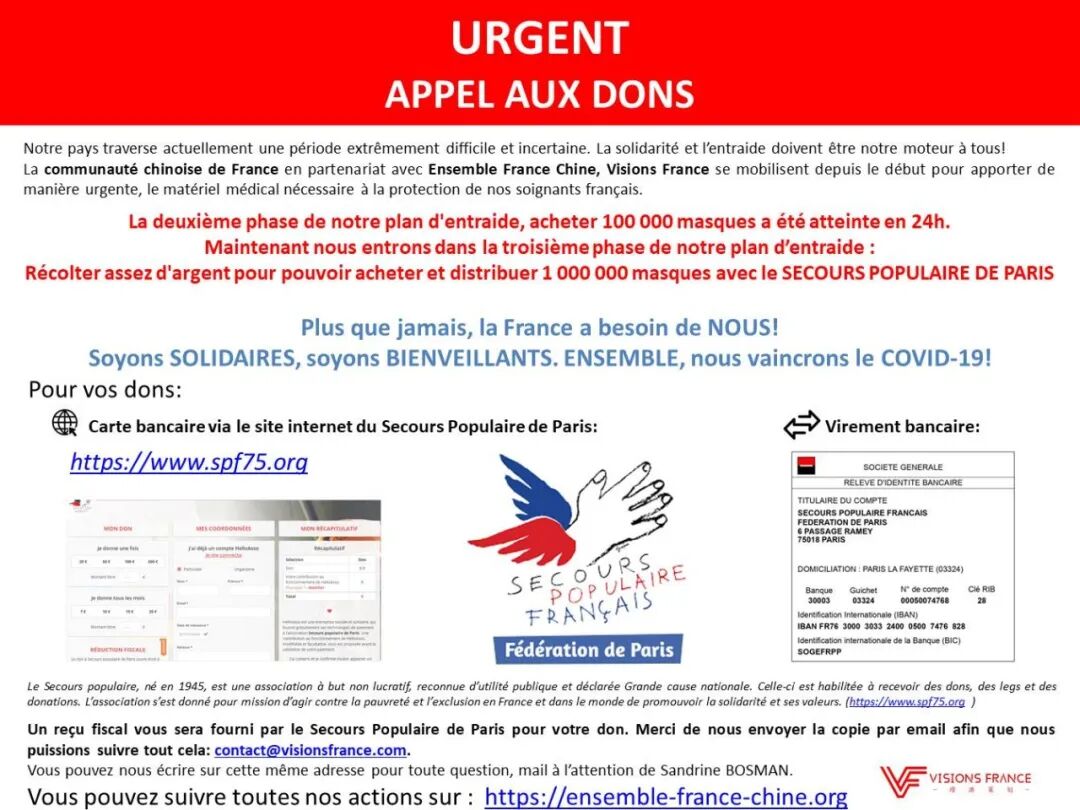 Association Ensemble France Chine协会旨在便于与巴黎大众救助会合作,分发通过“万众一心,共同战‘疫'”行动募捐并购买的100万个医用口罩。自3月20号起,其志愿者已经向全法多地区医院运送了10万多个口罩和一千多升的含酒精洗手液。协会也将会继续和巴黎大众救助会合作,共同募捐,一起战“疫”。