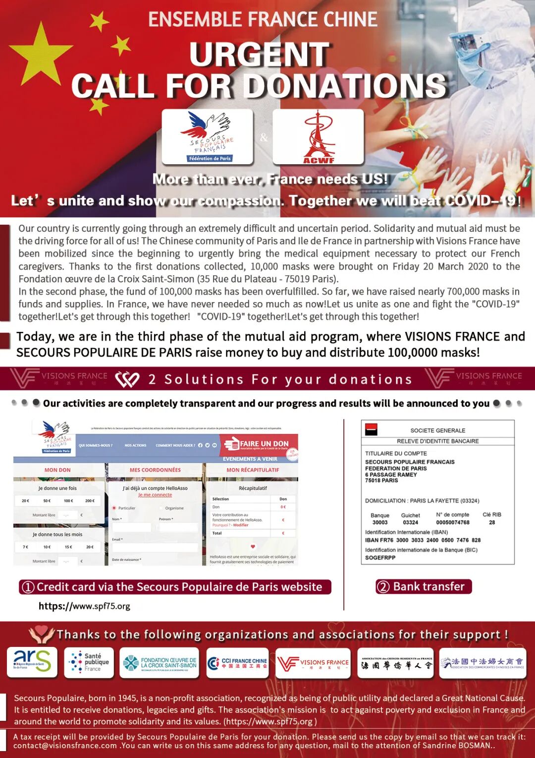 巴黎大众救助会将会提供税务收据。 感谢您将捐赠文件副本通过电子邮件([email protected])发送给我们,以便我们后期跟进。
