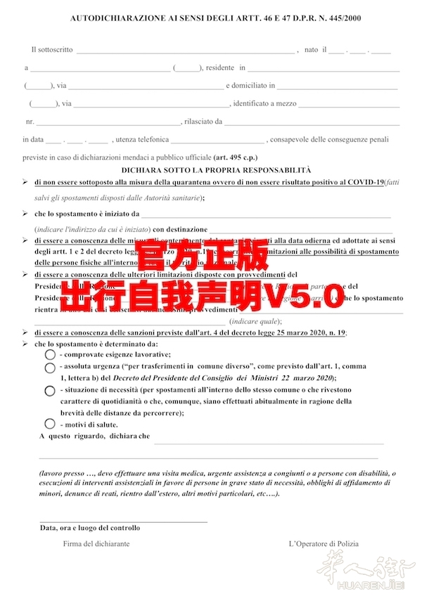 目前意大利自我出行证明仍然为3月26日发布的V5.0版,居民出行必须携带打印或是手写的自我出行声明表格,电子版出行自我声明无效。