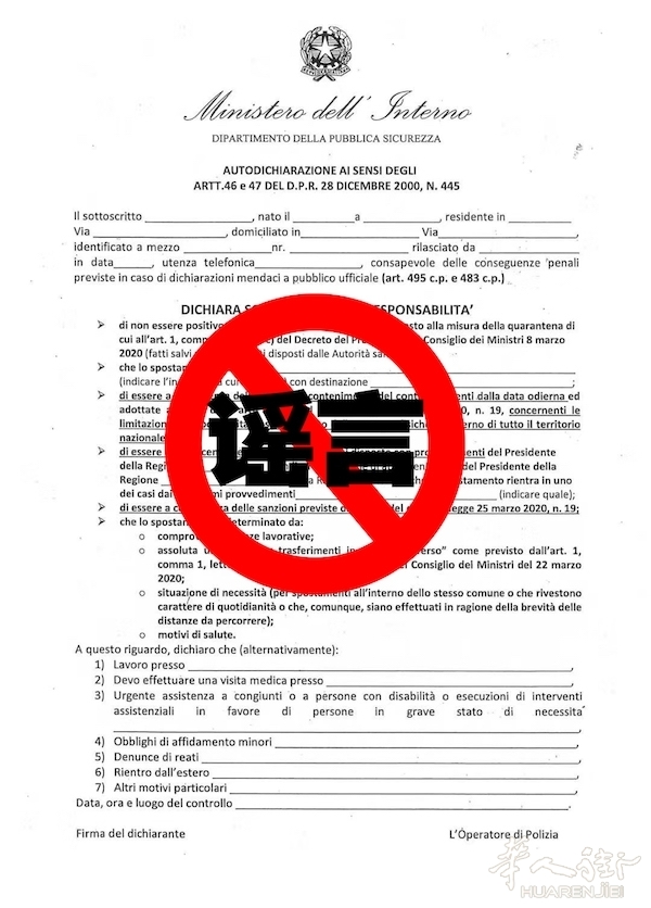 自从意大利新冠状病毒发生后为了约束居民出行意大利内政部发布了一份出行自我声明,如果有居民未携带出行自我声明将会被开出罚款和起诉。
