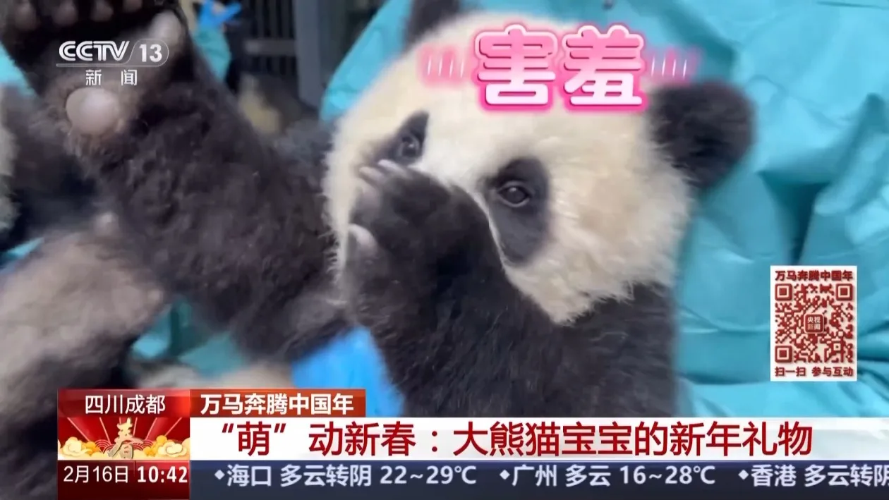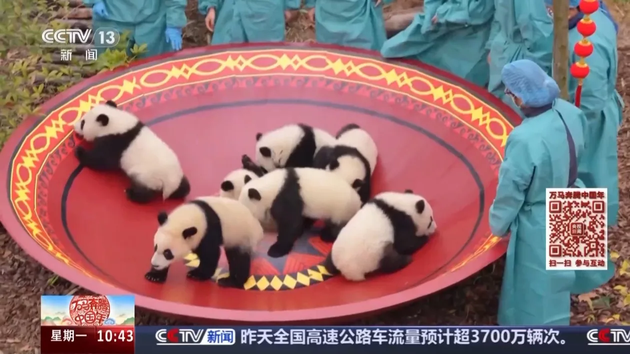 万马奔腾中国年,国宝也来贺新春,一群特别的“拜年团”——2025年新生大熊猫宝宝给全国观众送祝福了。 这些熊猫宝宝出生后一直在不同“熊猫妈妈班”生活成长,此次是它们第一次集体相聚,拍摄全家福。 面对镜头和初次见面的“小伙伴”,它们会兴奋张望、紧张不安,还是松弛自在?