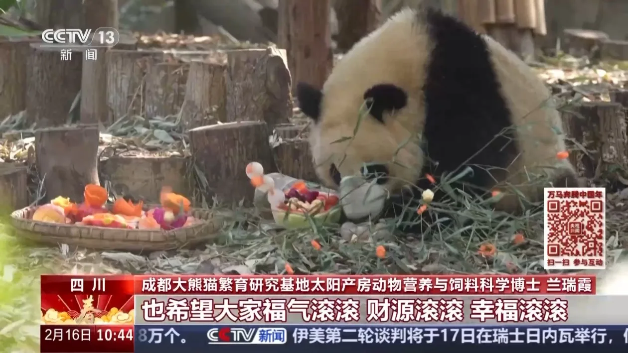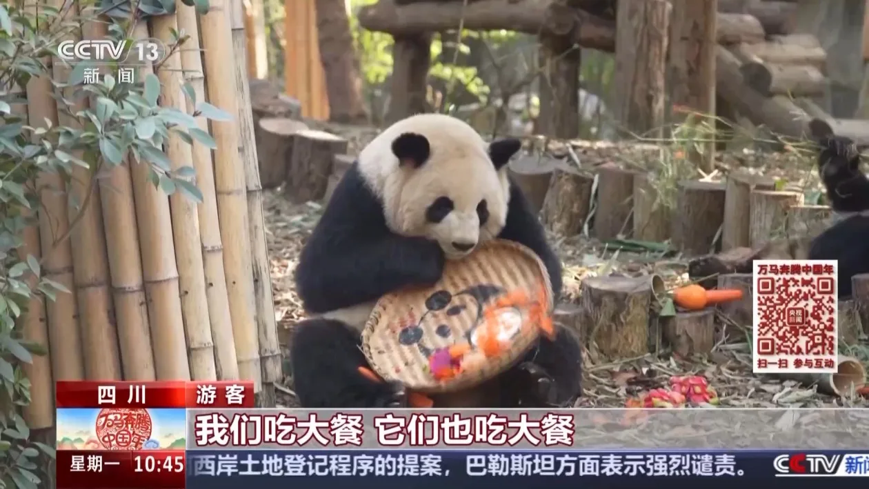 总台央视记者 蒋树林:这么多来自全国各地的游客,在成都过年来看大熊猫,来看大熊猫的新年大餐。