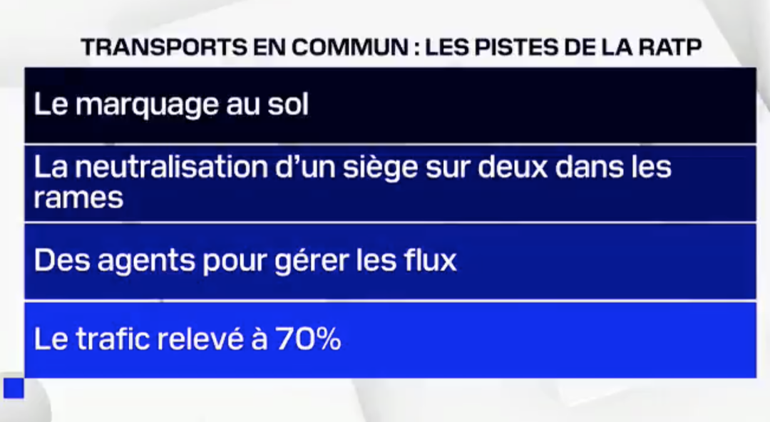 而RATP给出的回复是为了保证大家的健康安全解封之后会采取四项措施:「在地上标记号」「每两个座位就从中间隔开一个」「有工作人员来控制人流量」「将运力提升到隔离前的70%」