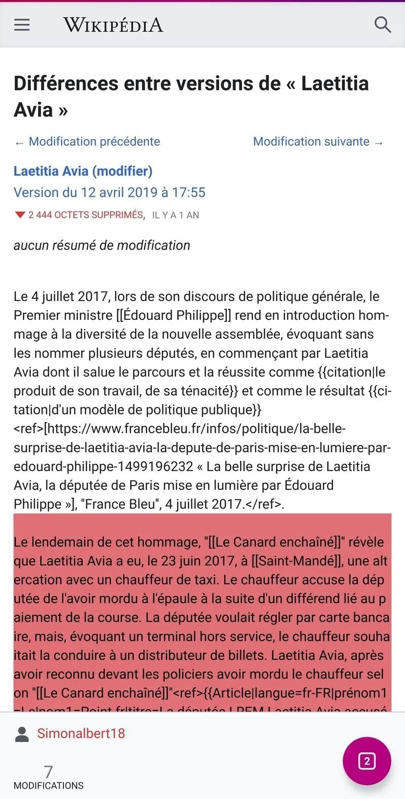 比如有网友发现,Avia曾经在2017年因为打车费的问题和一个司机起了争执,还咬了对方一口。这其实也没什么,不过后来她被发现竟然用挂着自己真名的账户,试图在维基百科上删掉这一段……这就有点尴尬了……