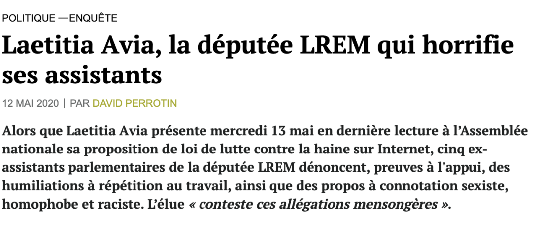 本文图片来自网络资料来源:https://www.mediapart.fr/journal/france/120520/laetitia-avia-la-deputee-lrem-qui-horrifie-ses-assistants?onglet=fullhttp://www.leparisien.fr/politique/accusee-d-humiliations-de-racisme-et-de-sexisme-par-d-ex-collaborateurs-la-deputee-lrem-laetitia-avia-veut-deposer-plainte-13-05-2020-8315952.php