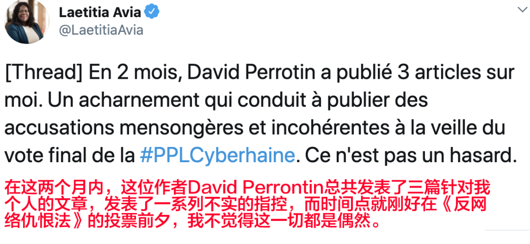 不过她认为,这篇文章的作者David PERROTIN已经不是第一次针对她发表类似的文章了。他这么做肯定有他自己的目的,比如反对Avia在国会中的提案。