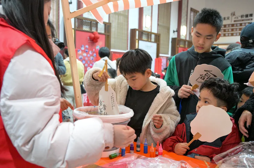 现场,逛市集、品年味、赏民俗的居民络绎不绝,处处洋溢着喜庆祥和的新春氛围。大家沉浸式体验漆扇绘制、福字拓印等非遗特色活动,感受传统文化的独特魅力。小小书法志愿者则挥毫泼墨,书写春联,免费发放给往来群众。一幅幅寓意吉祥的作品,传递着新春的美好祝福。