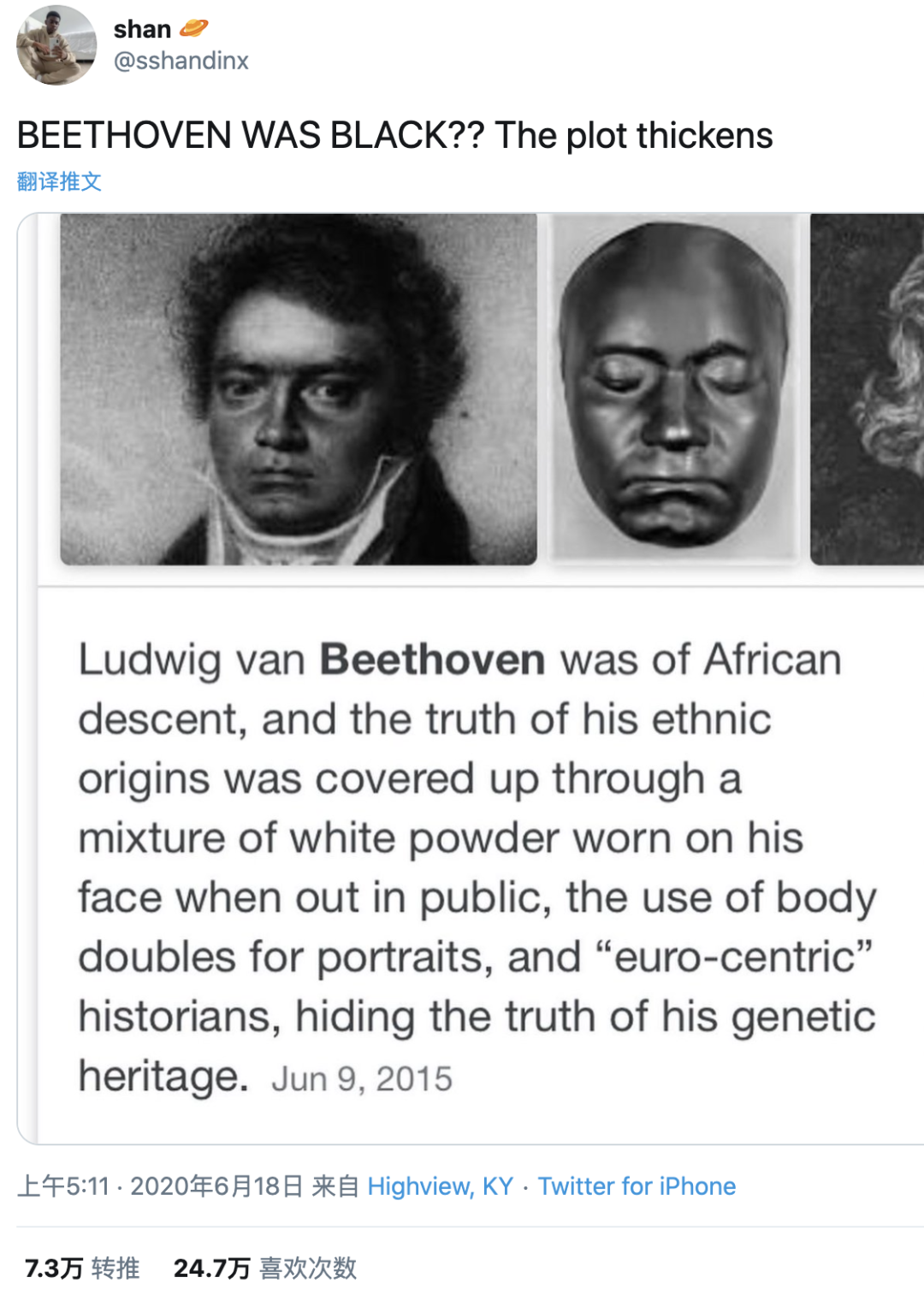 他在推文中写道,自己在阅读一篇和混血儿有关的文章时,无意中阅读到了这一段记录,里面提到,贝多芬其实是非洲人的后代。贝多芬后来怕被歧视,所以在出入公共场所时都靠往脸上涂白粉来掩盖自己的肤色。