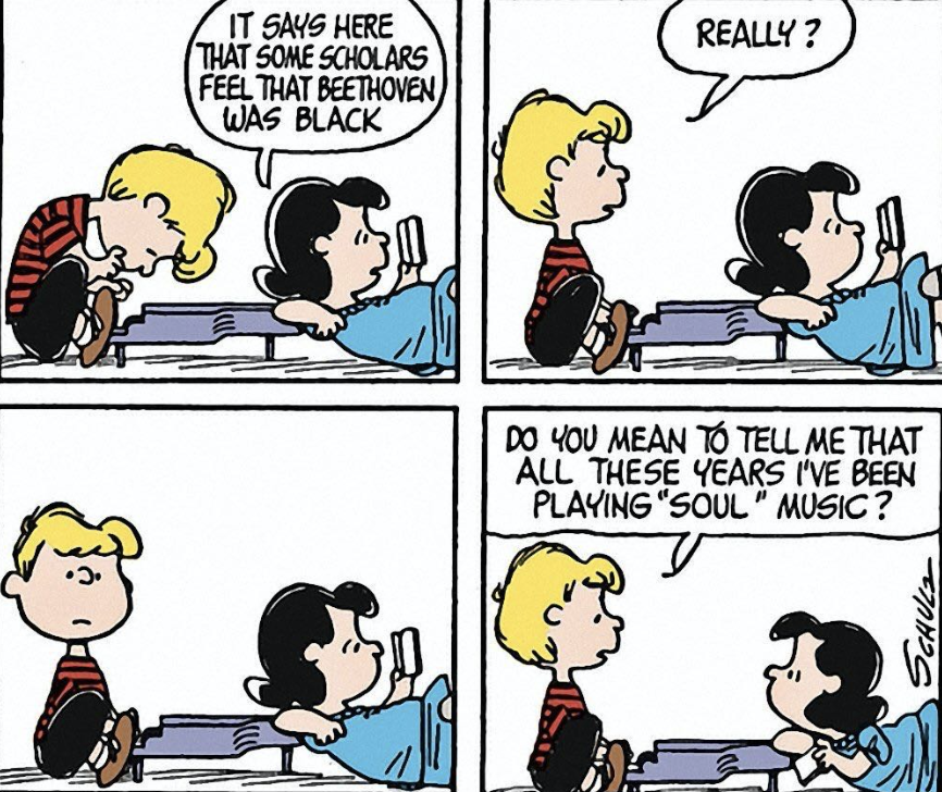 但当时刚好处在黑人意识的觉醒期,突然有人说伟大的音乐家贝多芬其实是个黑人,这种说法还是非常吸睛的。甚至在1969年的《花生漫画》中,里面的角色就提到过「贝多芬是黑人」这件事,可见这种说法确实历史悠久。