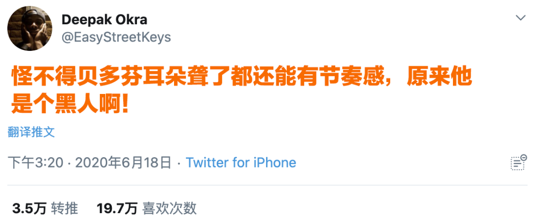 已经有超过26万条推文在讨论贝多芬的种族问题贝多芬是黑人,似乎已经快成了一件板上钉钉的真相……加上最近BLM运动的大背景,这一「伟大发现」无疑是振奋了黑人兄弟们的斗争精神。甚至还有黑人网友开始把贝多芬的成就归功于「黑人有音乐天赋」这一点上……