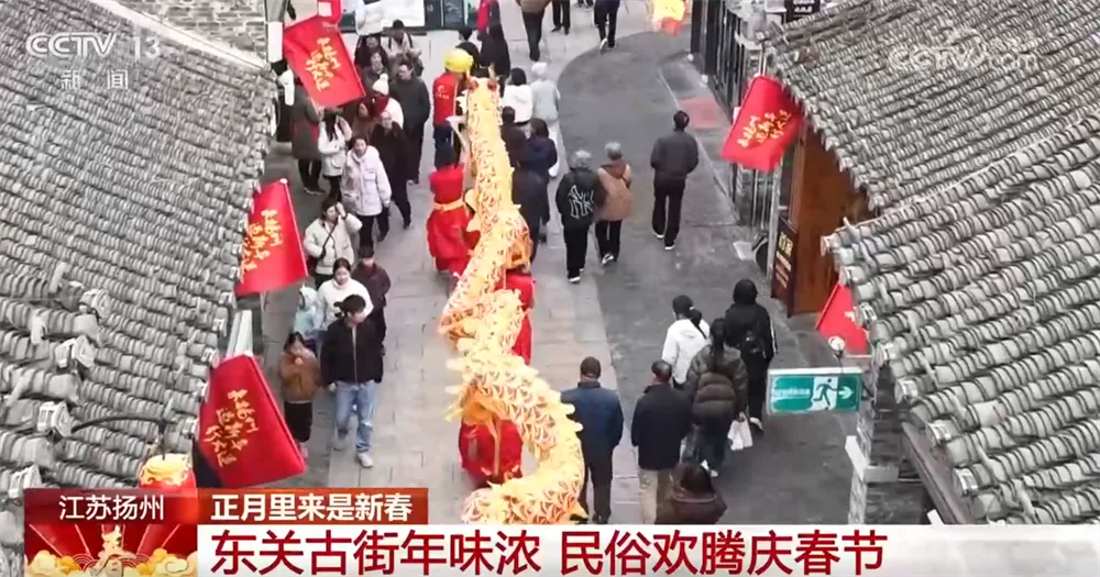 我们现在看到的是江苏扬州东关历史文化街区。春节假期,东关城门之下,舞龙表演热闹开场,金龙翻腾跳跃、气势昂扬,铿锵有力的音乐此起彼伏,引得市民游客纷纷驻足围观、拍手叫好,将新春的喜庆氛围推向高潮。